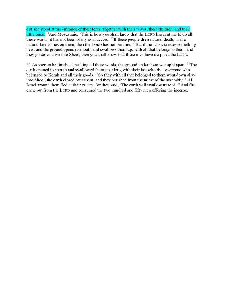 Another thing: In vv. 24 and 27, where the NRSV has “So they got away from the dwellings of Korah, Dathan and Abiram,” the Hebrew for dwelling is singular: mishkan, “tent.” More to the point, this is specific word for the Tent of Meeting, as opposed to an ordinary tent, which is an ohel, as in v. 26. I propose that God in the original source told the Israelites to get away from the Tent of Meeting; an editor has come in and added “of Korah, Dathan and Abiram” in an attempt to tie the two sources together. In v. 26, the same editor has added “the tents of” for the same purpose, where the original read, “Turn away from these wicked men…” I’ll replace NRSV’s “dwellings” in these two places with “Tent.” So the final division is this: