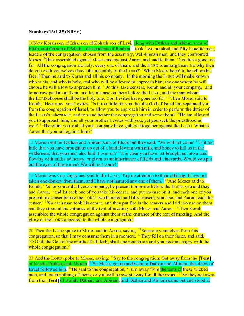 Let’s start by isolating the passages which deal either with Korah alone and Moses and Aaron together (yellow), or with Dathan and Abiram together and Moses alone (blue).